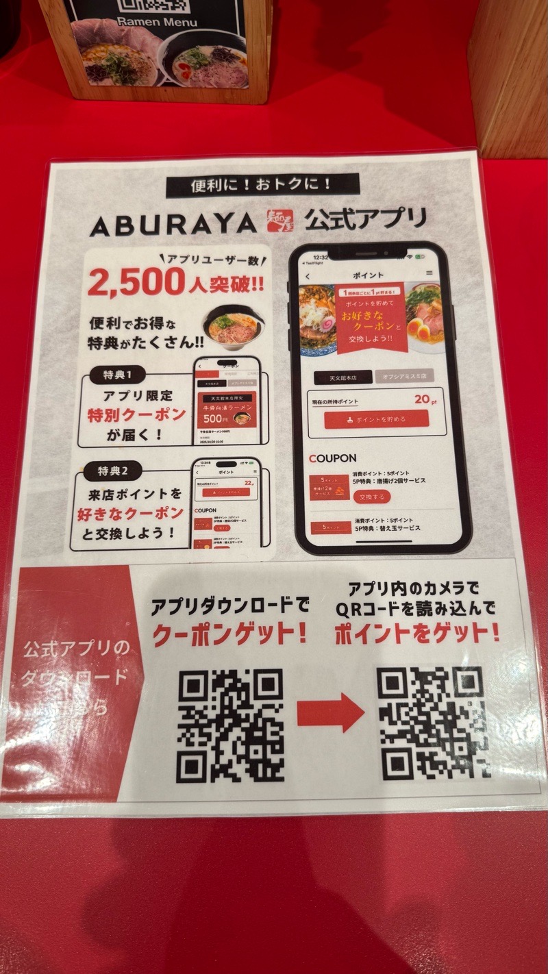 鹿児島お得情報サイト「かごトク」グルメに旅行、キャンプなどお得情報を発信 > コラム > 鹿児島らーめん 麺屋あぶらや天文館本店 -ABURAYA- 鹿児島らーめん 麺屋あぶらや天文館本店 -ABURAYA- ラーメン激戦区天文館で頑張るラーメン店 名前は聞いたことがありましたが 初入麺です! 店は綺麗 看板見ると セットにしたくなっちゃうんですよ( i _ i ) 食券制なので 事前に食べるものを決めておきましょう! カウンター 公式アプリあり 各種調味料はテーブルの上に 気に入ったらダウンロードしましょう! 牛骨白湯ラーメン からあげ ご飯セット! 食べ過ぎ… スープは白濁した博多風ですが、麺は中太面です 牛骨ラーメンって?でしたけど、そこまでクセがなく、食べやすかった(^ ^) この投稿をInstagramで見る TuuBouのグルメ旅🥂(@tuubou.no.gurume)がシェアした投稿